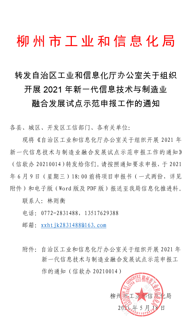 轉(zhuǎn)發(fā)自治區(qū)工業(yè)和信息化廳辦公室關于組織開展2021年新一代信息技術與制造業(yè)融合發(fā)展試點示范申報工作的通知(2021年5月18日)