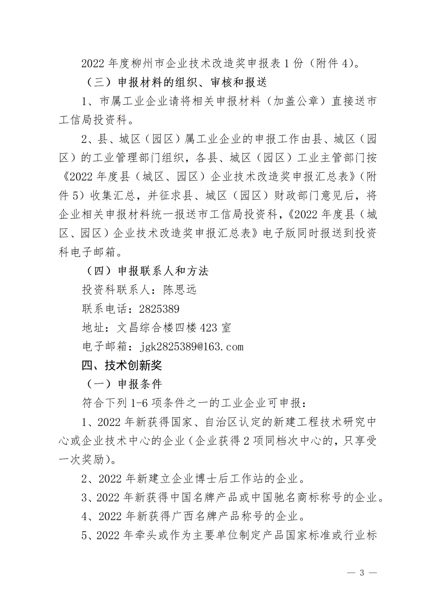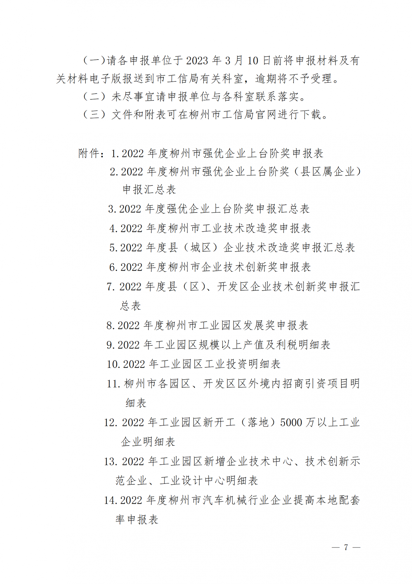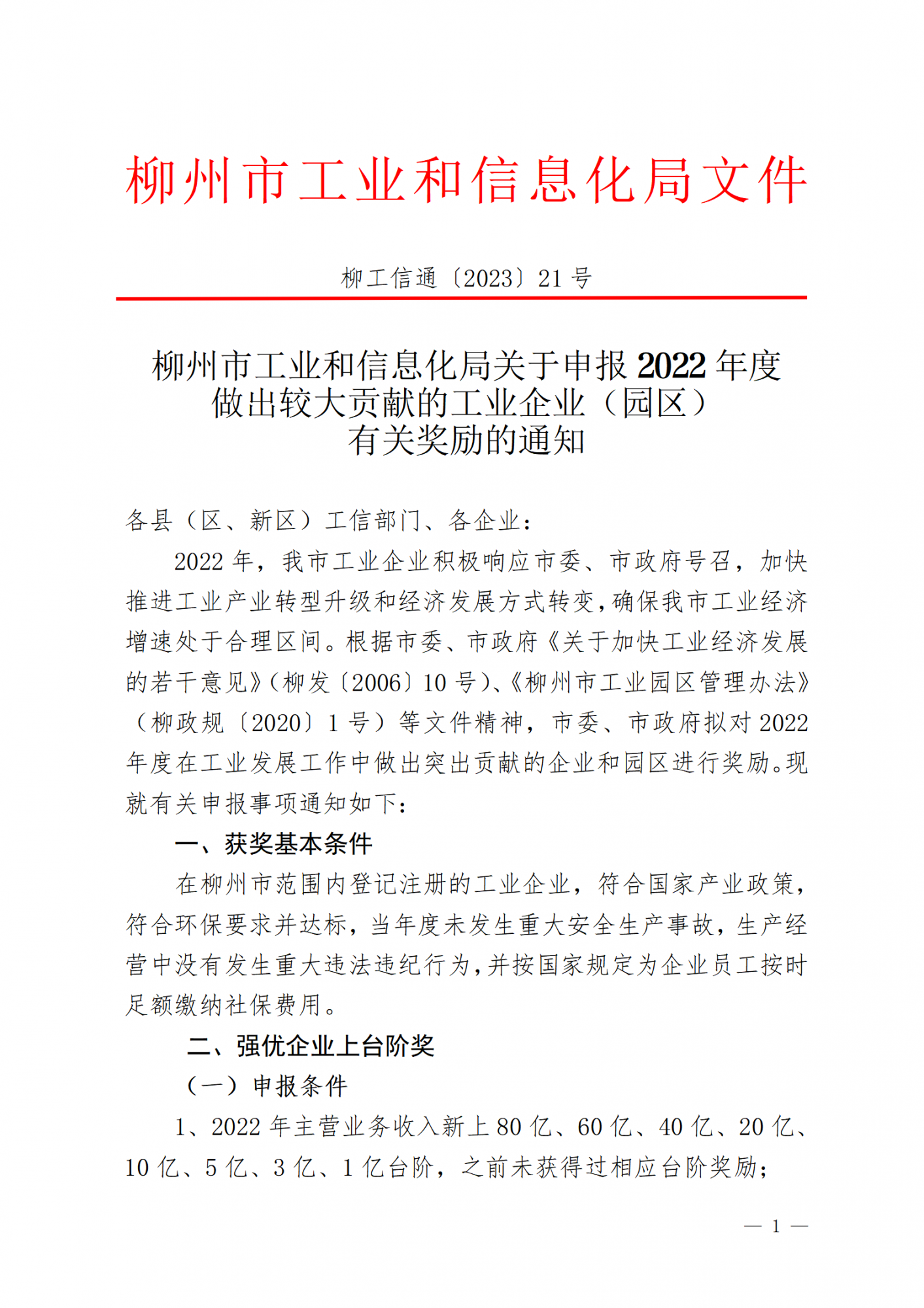柳州市工業(yè)和信息化局關(guān)于申報(bào)2022年度做出較大貢獻(xiàn)的工業(yè)企業(yè)(園區(qū))有關(guān)獎(jiǎng)勵(lì)的通知(2023-02-28)
