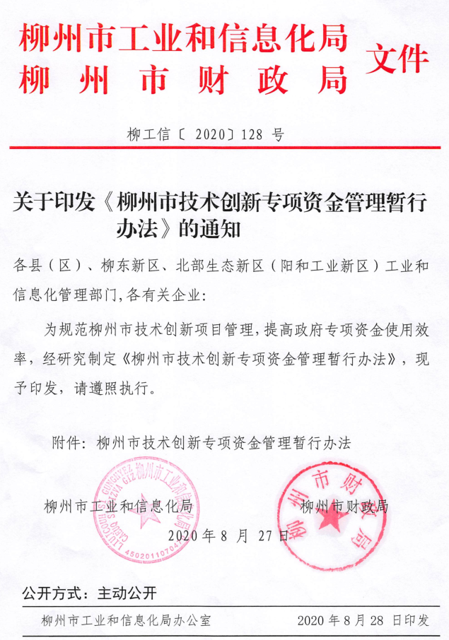 轉(zhuǎn)發(fā):關(guān)于印發(fā)《柳州市技術(shù)創(chuàng)新專項(xiàng)資金管理暫行辦法》的通知(2020-10-10)