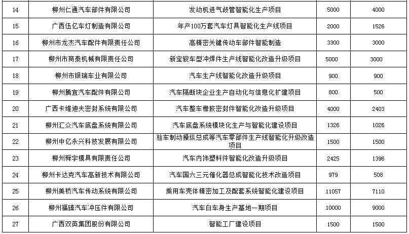 根據(jù)《廣西壯族自治區(qū)工業(yè)和信息化發(fā)展專(zhuān)項(xiàng)資金管理辦法》,在地市推薦上報(bào)的基礎(chǔ)上,經(jīng)組織專(zhuān)家認(rèn)真評(píng)審,現(xiàn)將擬支持2021年汽車(chē)行業(yè)企業(yè)智能化改造升級(jí)項(xiàng)目名單予以公示。公示期為2020年12月17日-12月19日。如對(duì)公示內(nèi)容有異議,請(qǐng)以書(shū)面形式,并署真實(shí)姓名和聯(lián)系地址,于公示期內(nèi)郵寄或直接送到自治區(qū)工業(yè)和信息化廳汽車(chē)處(直接送達(dá)以送達(dá)日期為準(zhǔn);郵寄以郵戳到達(dá)日期為準(zhǔn))。地址:南寧市民族大道113號(hào)322室,郵政編碼:530022,聯(lián)系電話:0771-8095126。