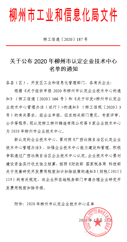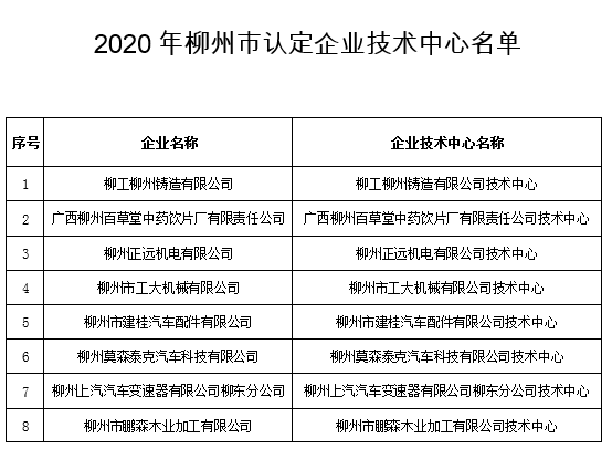 關(guān)于公布2020年柳州市認(rèn)定企業(yè)技術(shù)中心名單的通知(2020.12.31)