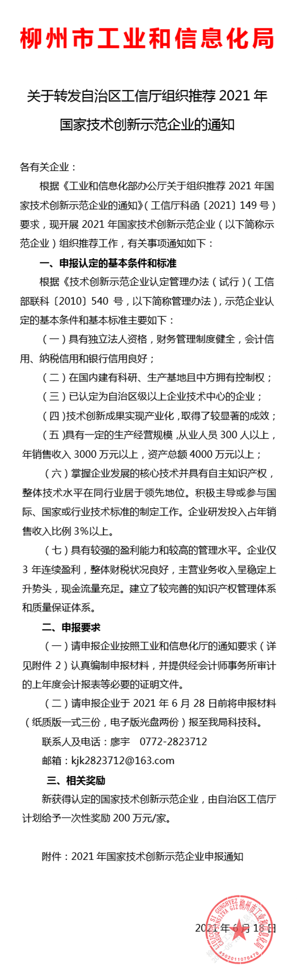 關(guān)于轉(zhuǎn)發(fā)自治區(qū)工信廳組織推薦2021年國(guó)家技術(shù)創(chuàng)新示范企業(yè)的通知(2021-06-21)