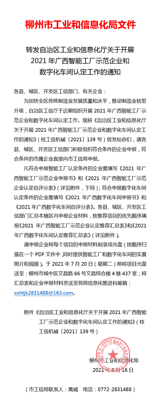附件:自治區(qū)工業(yè)和信息化廳關于開展2021年廣西智能工廠示范企業(yè)和數字化車間認定工作的通知(桂工信機械〔2021〕139號).rar